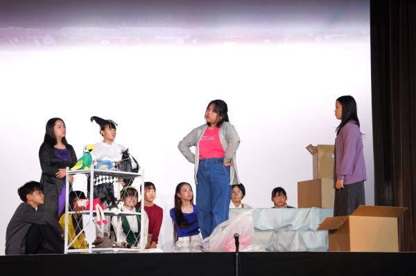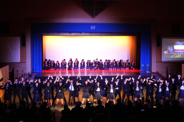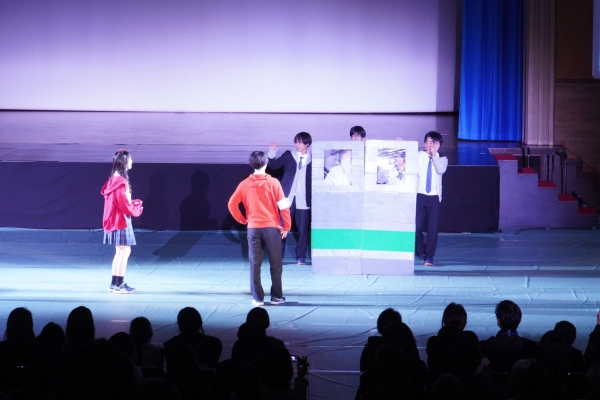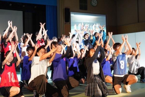 中学3年生は毎年恒例の身体表現をホールで行い、今年のテーマである「Utopia」と学校生活を掛け合わせたストーリーを、演技やダンスなどを通して全身で表現しました。