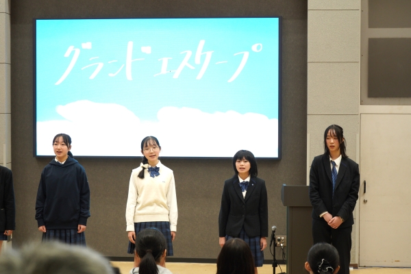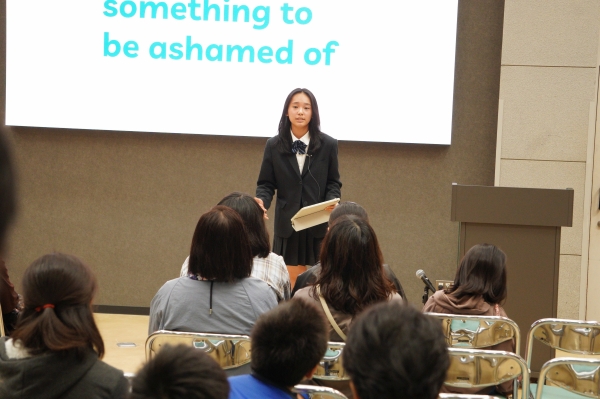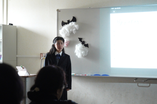 中学1年生は全員が自己理解をテーマに発表を行い、視聴覚室では中学1年生と高校1年生の選出された代表によるプレゼンテーションや英語でのレシテーション・スピーチが行われました。