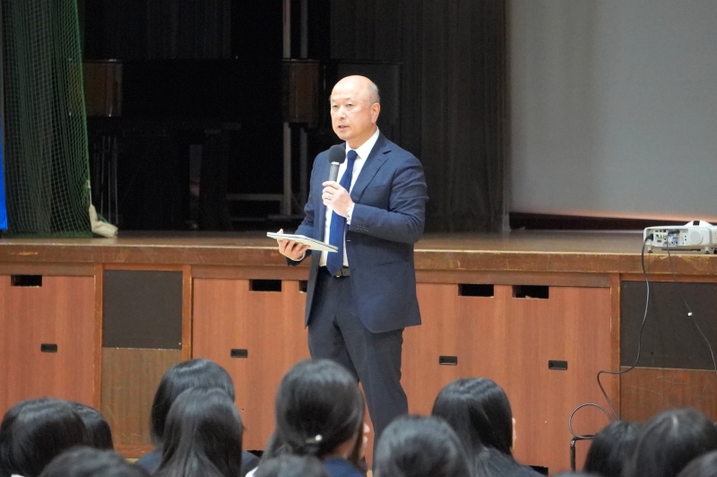 高校校長は、「無用の用」という言葉を中心に、複数の人物や作品を例に挙げながら柔軟な発想の重要性を語りかけました。社会や世の中に足りないもの(穴)に対してどう考え、どう行動するか、生徒たちに問いかける内容でした。